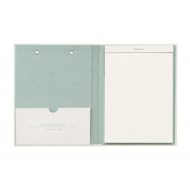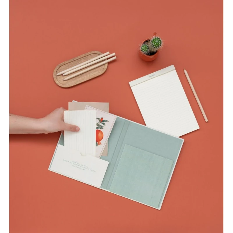 Esta carpeta de tamaño A5 con diseño Botanical Cactus cuenta con un pinza exterior para sujetar folios y facilitar la escritura. Está cubierta por tapa dura de cartón con papel laminado en mate.