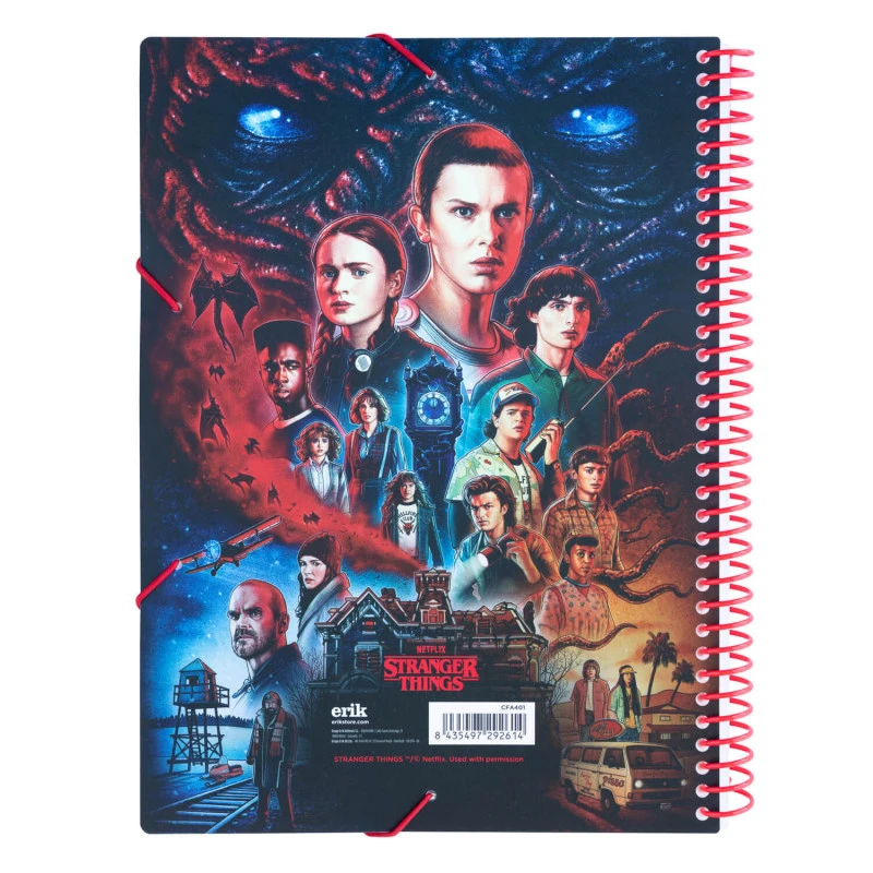 Esta carpeta de fundas A4 de Stranger Things es perfecta para la oficina, la universidad o para uso escolar. Contiene 30 fundas transparentes de polipropileno que permiten almacenar y organizar todos tus documentos de una forma práctica y efectiva. Cuenta con una espiral de anillas flexible y dos gomas elásticas para un cierre de mayor seguridad.