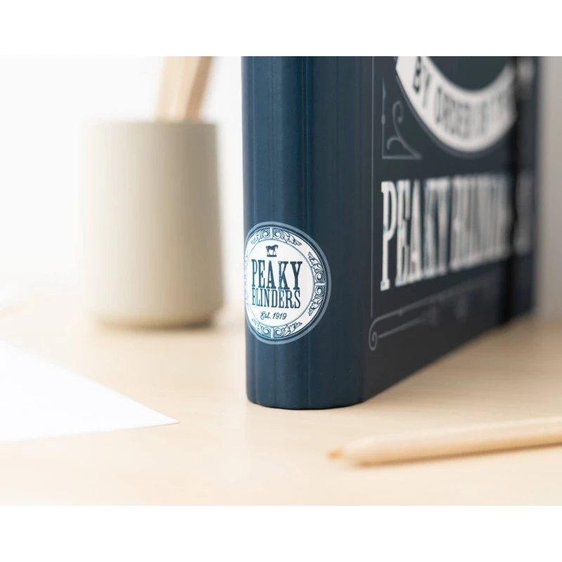Esta carpeta escolar de Peaky Blinders está elaborada en tapa dura de cartón de 2 mm de grosor forrada con papel mate de 150 g/m2. Tiene un tamaño de 32 centímetros de alto por 28 de ancho.