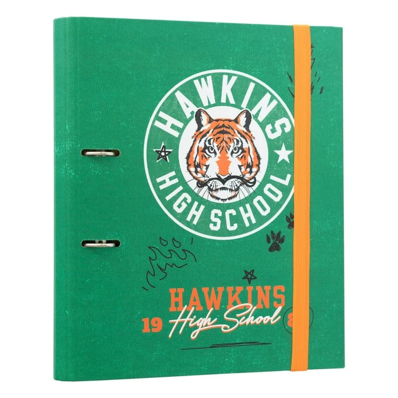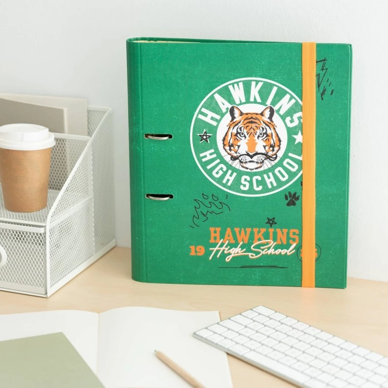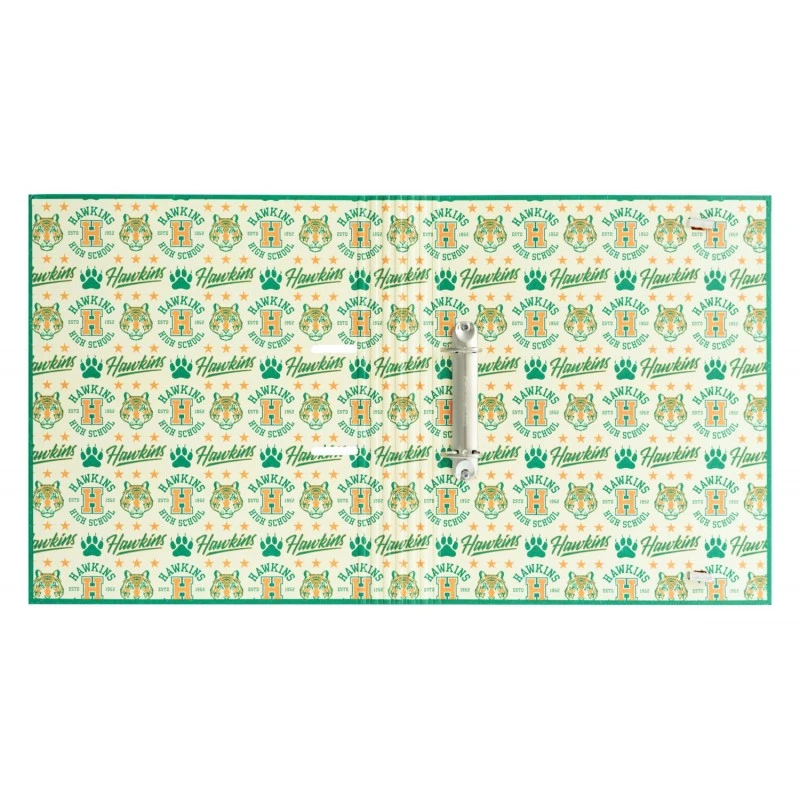 Esta carpeta de Stranger Things está elaborada en tapa dura de cartón de 2 mm de grosor forrada con papel mate de 150 g/m2. Presenta una encuadernación con 2 anillas y tiene un tamaño de 32 centímetros de alto por 28 de ancho. Incluye una varilla compresora y cierre de banda elástica de 9 mm. Cuenta con diseño interior personalizado acorde al diseño exterior.