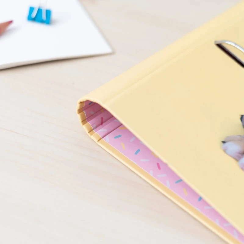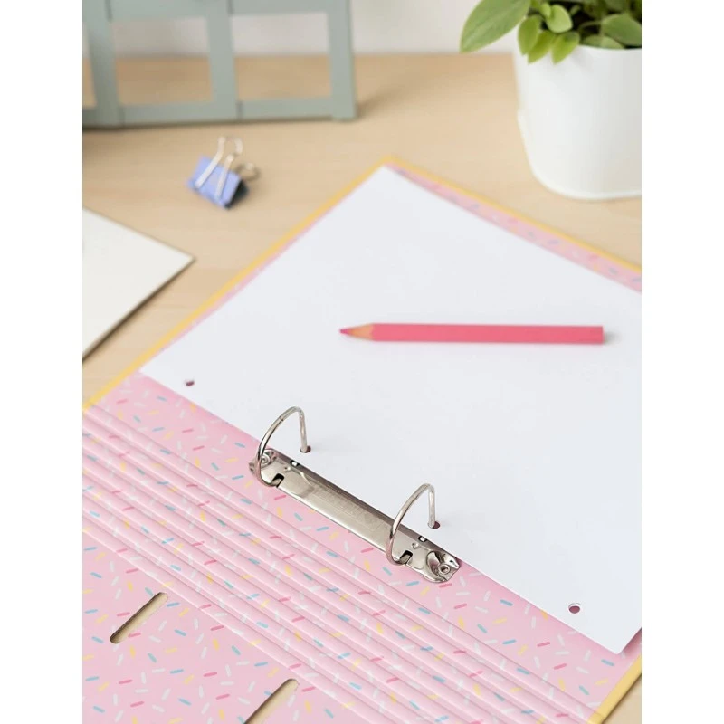 - Encuadernación con 2 anillas y cierre de banda elástica.