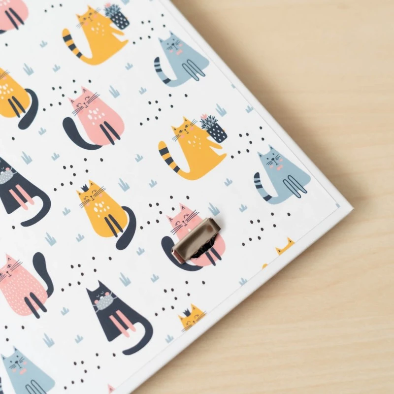 La carpeta escolar Cute Cats está elaborada en tapa dura de cartón de 2 mm de grosor forrada con papel mate de 150 g/m2. Tiene un tamaño de 32 centímetros de alto por 28 de ancho.