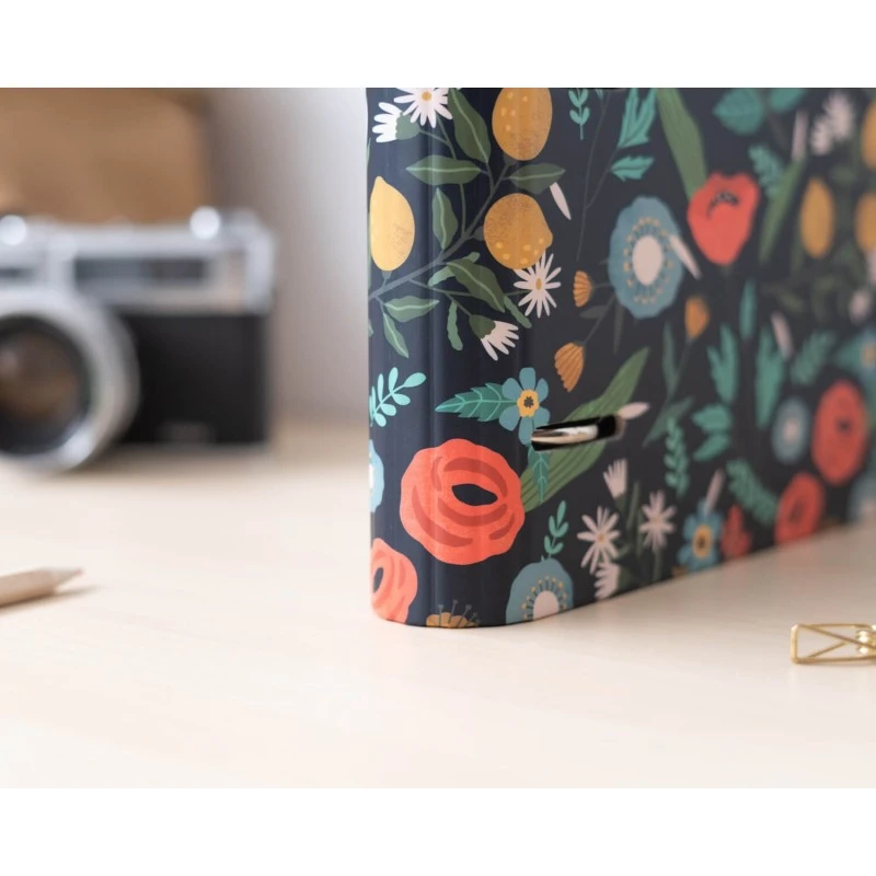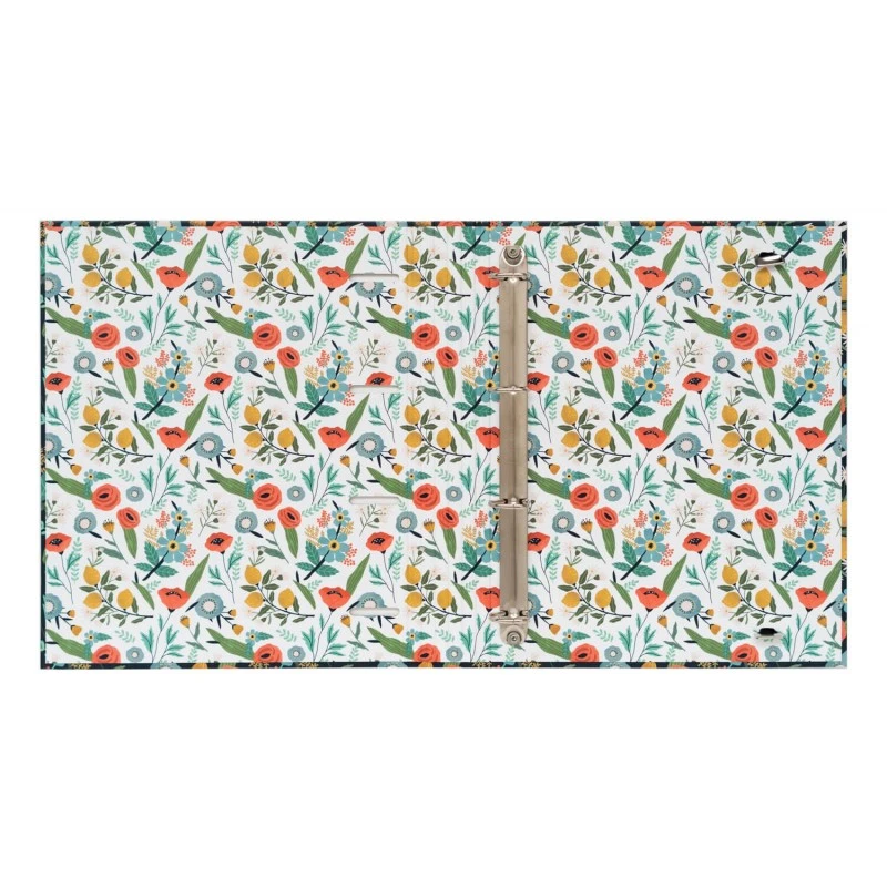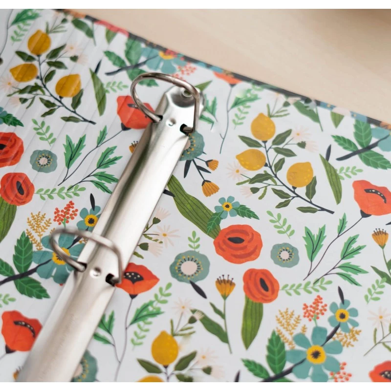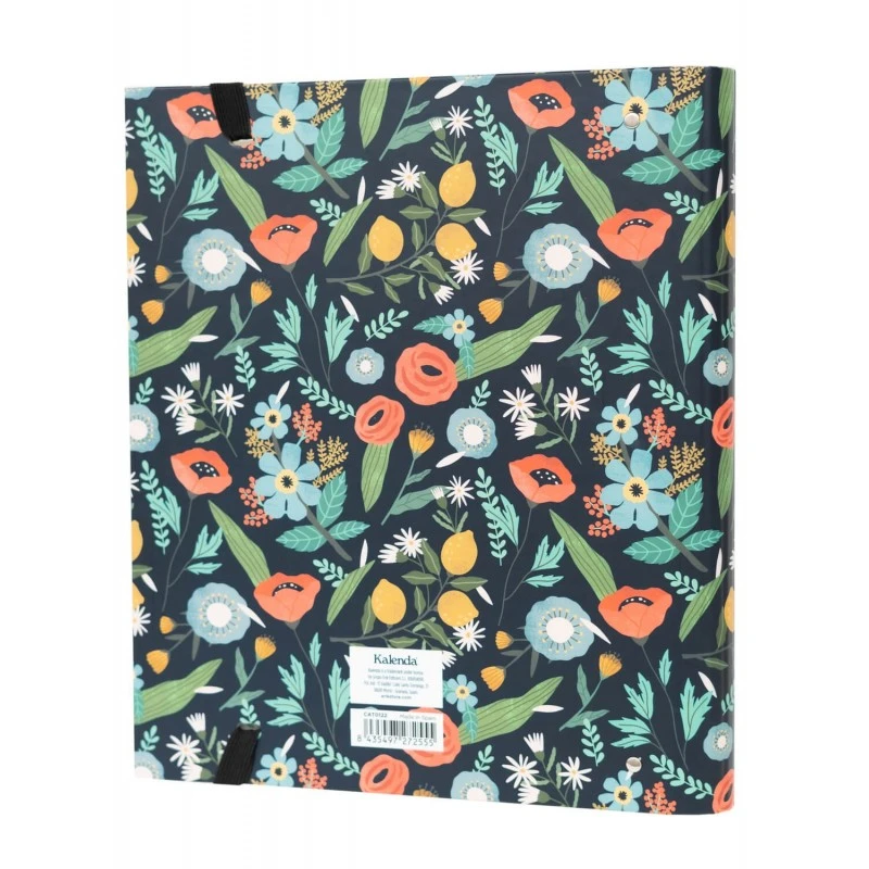 Presenta una encuadernación con 4 anillas y cierre de banda elástica de 9 mm. Cuenta con un diseño personalizado tanto en el exterior como en el interior.