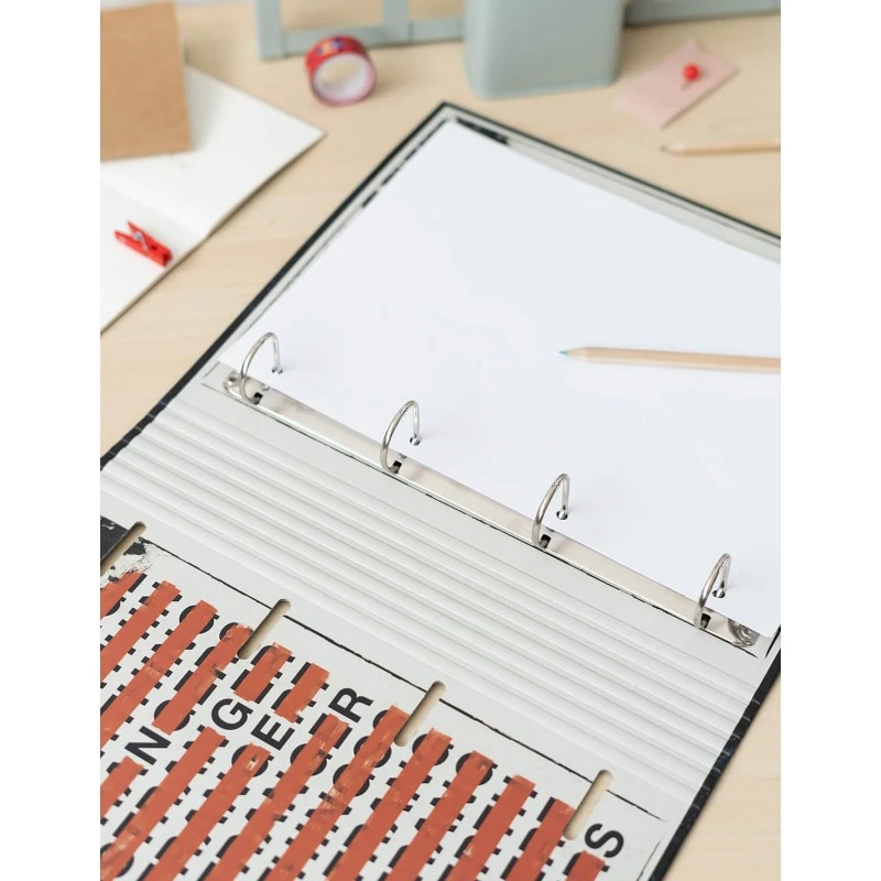 Presenta una encuadernación con 4 anillas y cierre de banda elástica de 9 mm. Cuenta con un diseño personalizado tanto en el exterior como en el interior.