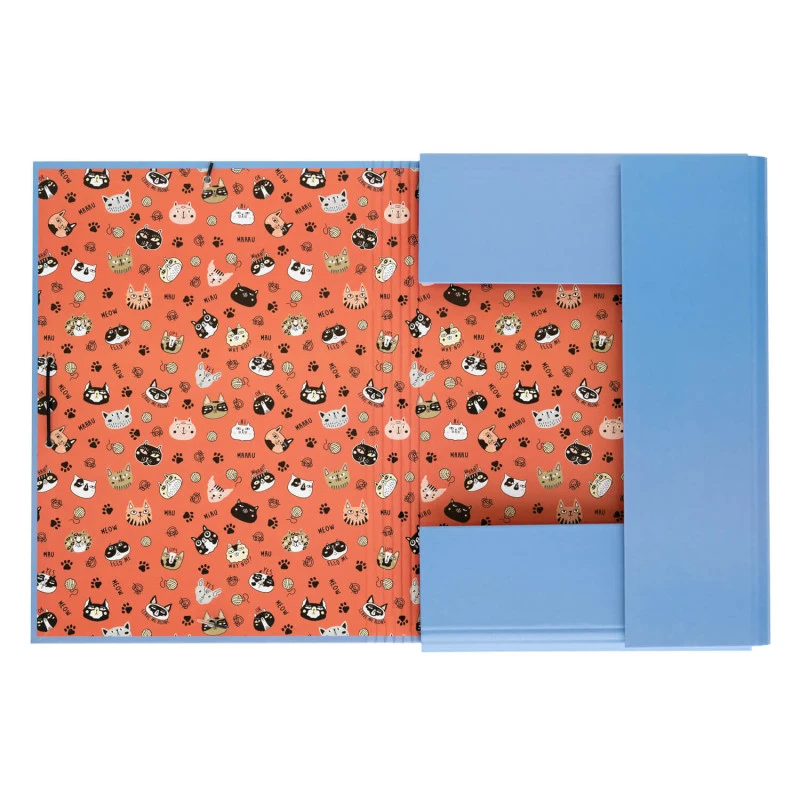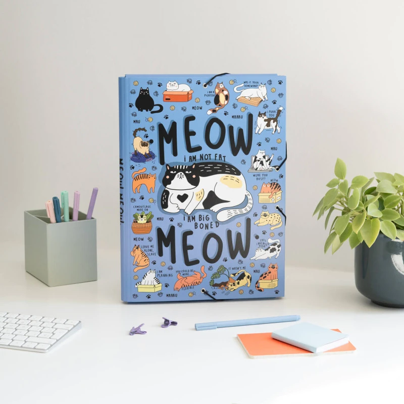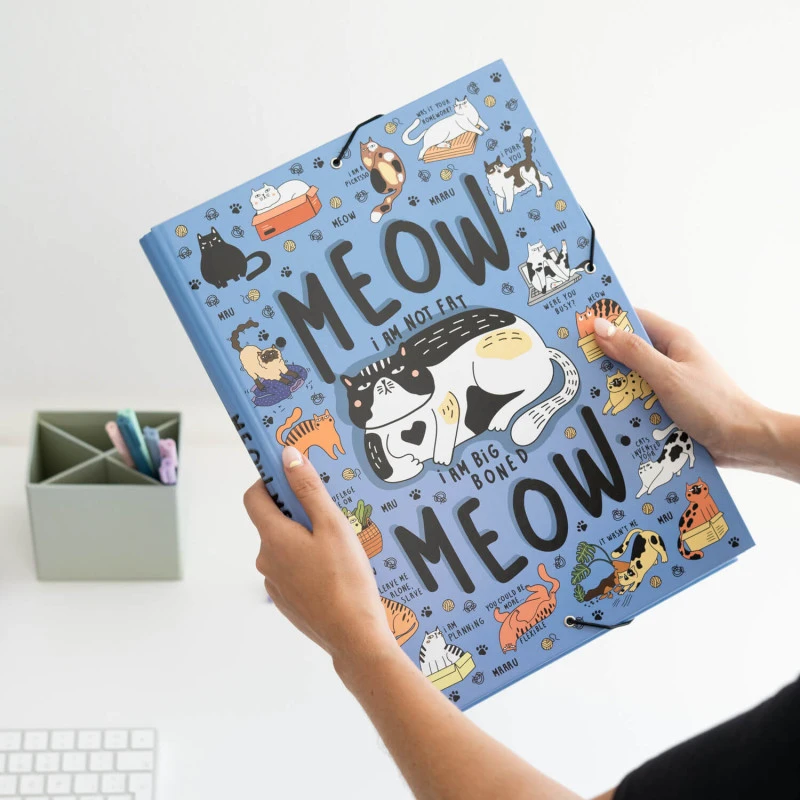 Esta carpeta de gatos de la colección Meow Meow está elaborada en tapa dura de cartón de 2 mm de grosor forrada con papel laminado en mate de 150 g/m2. Tiene un tamaño de 34 cm de alto por 25,5 cm de ancho.