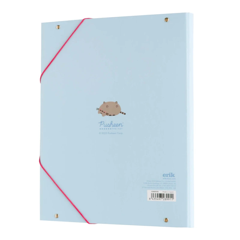 Esta carpeta escolar de Pusheen está elaborada en tapa dura de cartón de 2 mm de grosor forrada con papel mate de 150 g/m2. Respecto a su tamaño, mide 34 centímetros de alto por 25,5 de ancho.