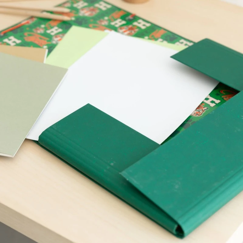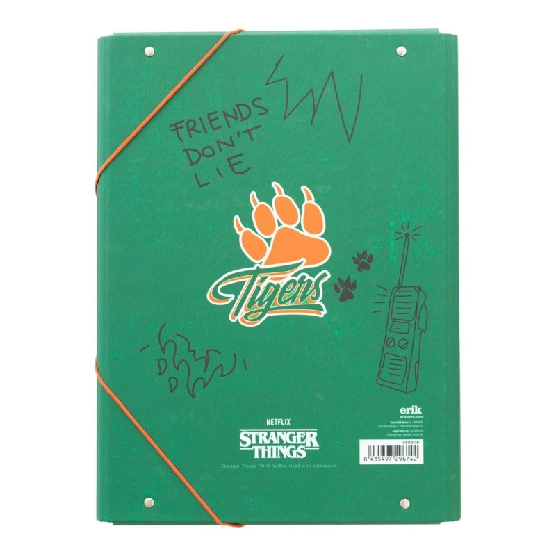 Esta carpeta de Stranger Things ha sido elaborada en tapa dura de cartón de 2 mm de grosor forrada con papel mate de 150 g/m2. Respecto a su tamaño, mide 34 centímetros de alto por 25,5 de ancho.