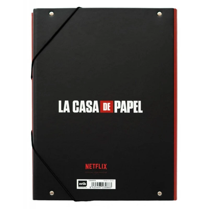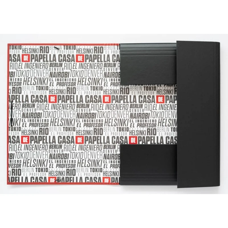 Carpeta La Casa de Papel fabricada con materiales de alta calidad, manteniendo los diseños más actuales. Tiene unas medidas de 24 x 34 cm. Contiene 3 solapas flexibles, 2 de ellas de unas medidas de 13 x 23 cm y otra de 13 x 34 cm. Su tapa es de cartón duro con un espesor de 2 mm forrada en papel con acabado en mate. Su interior tambien esta personalizado.