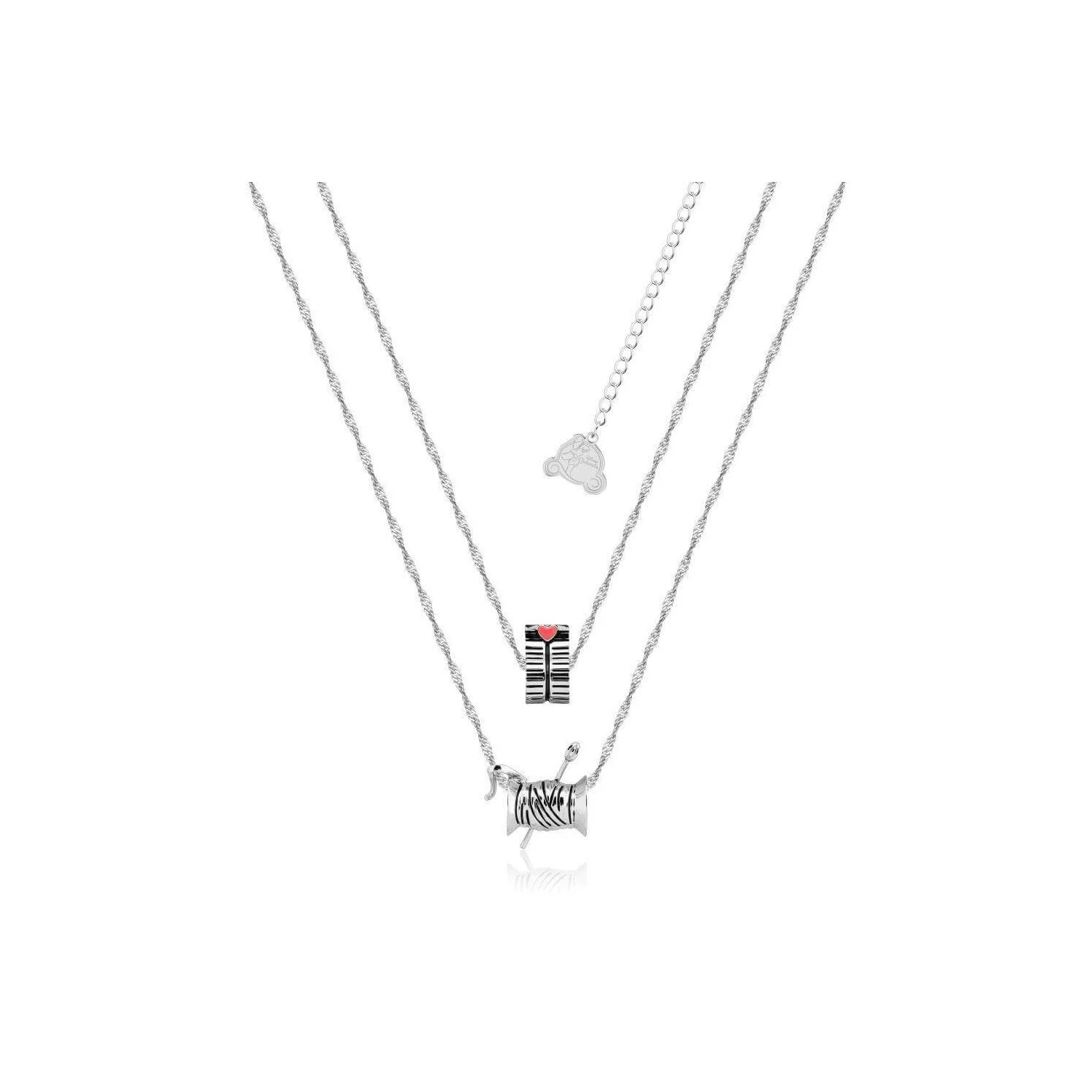 - La cinta métrica y la madeja de hilo que los ratones emplearon para hacerle un vestido a Cenicienta para el baile representados en dos ornamentados abalorios.