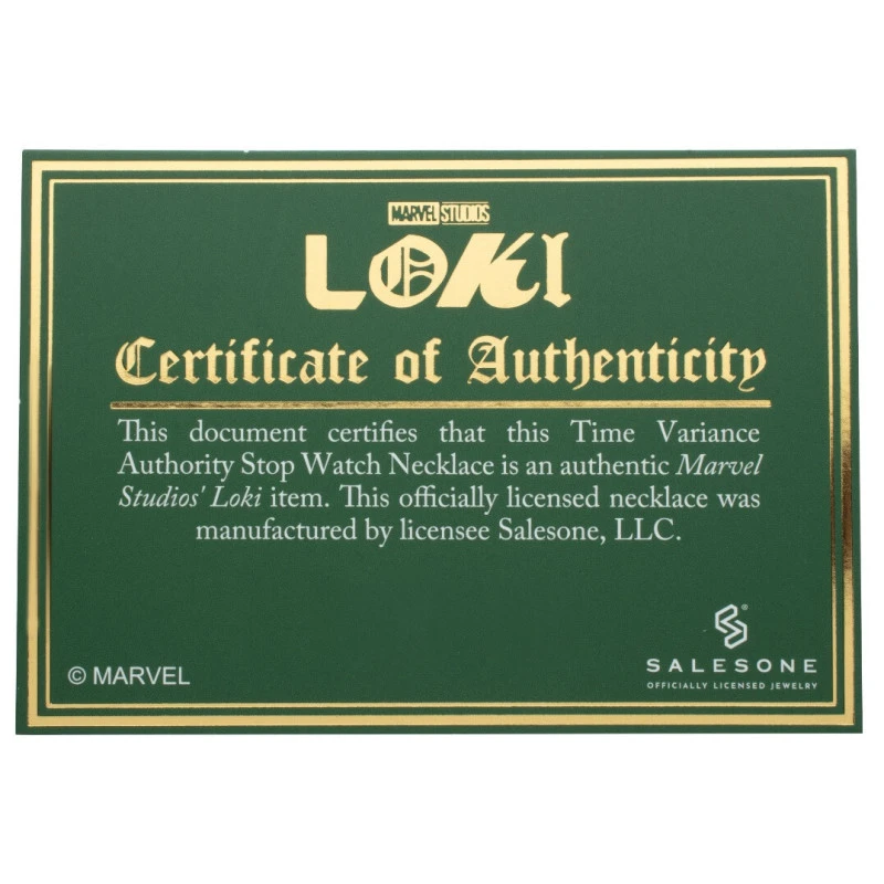 Este colgante es una réplica del reloj de la Autoridad de Variación Temporal que aparece en la serie Loki de Marvel. Está fabricado en aleación de zinc de gran calidad y cuenta con una cadena fabricada en acero inoxidable.