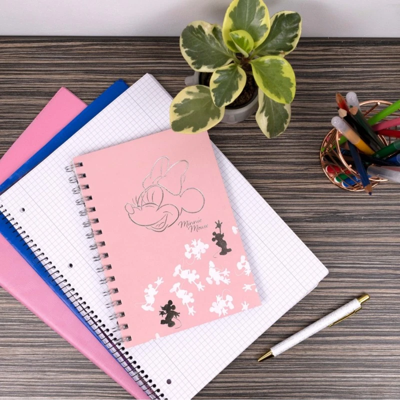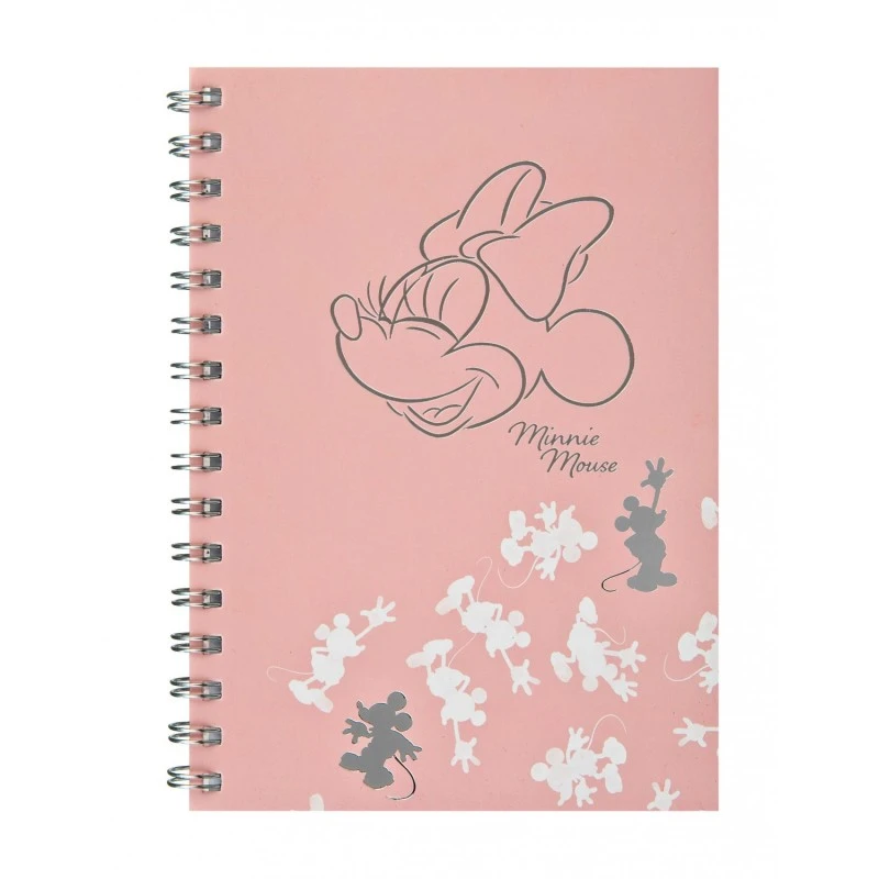 Este cuaderno de Minnie Mouse pertenece a la colección Disney 100 Aniversario y se compone de 80 hojas de tamaño A5 fabricadas en papel FSC de 80 g/m² con plata/oro rosa en el lateral. La encuadernación es de tipo wire-o con doble espiral metálica.