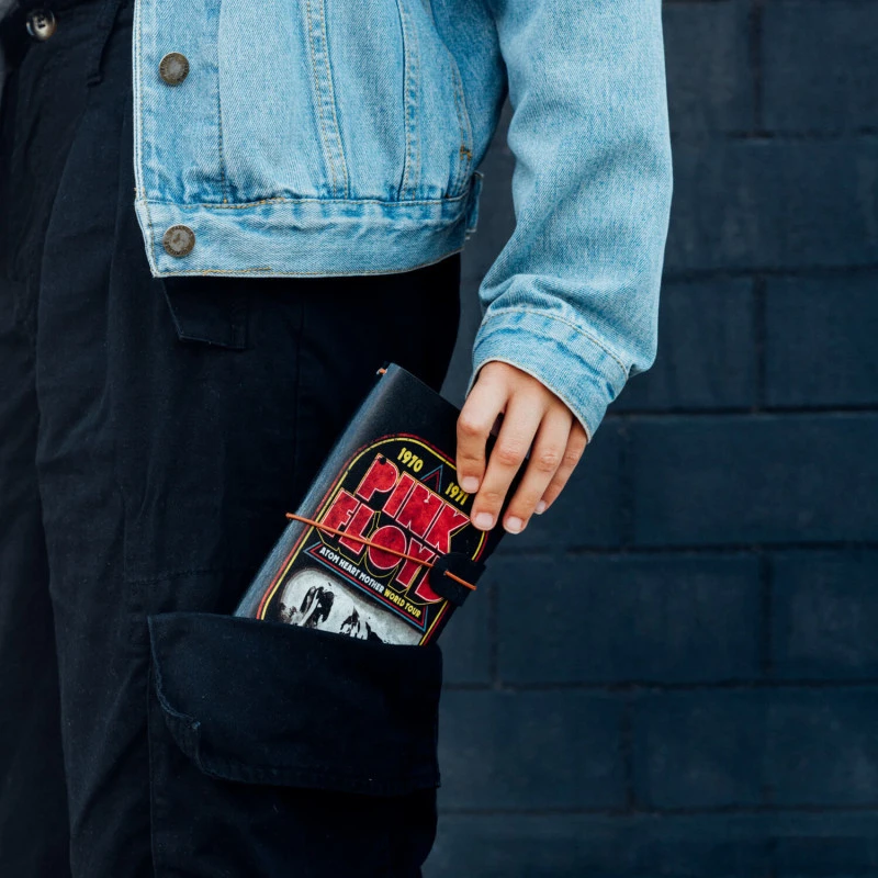 Este cuaderno de viaje de Pink Floyd está compuesto por dos cuadernillos reemplazables de 80 hojas (160 páginas) con dos tipos de hoja diferentes: bullet (puntos) y lineas. Cuenta con espacio para tarjetas y un bolsillo en la parte interior.