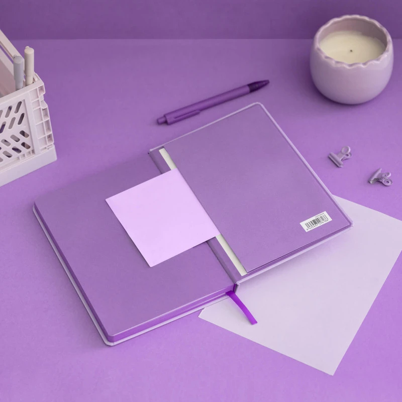 Presenta cubierta de tapa dura laminada en mate con tacto suave y tiene encuadernación encolada. Cuenta con una cinta con función de marcapáginas y un bolsillo interior en la parte trasera.
