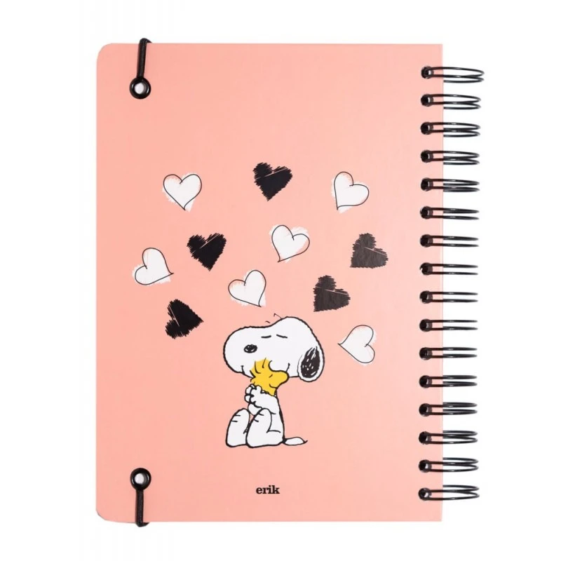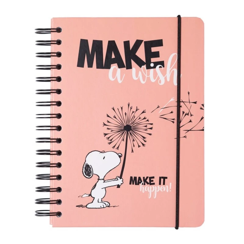 Nuevo cuaderno A5 de Snoopy. Presenta cubierta de tapa dura forrada con efecto holográfico laminada en mate, cubiertas interiores personalizadas, esquinas redondas, encuadernación de alambre y cierre con banda elástica. Interior punteado con greca y bolsillo extensible. Fabricada con licencia 100% oficial.