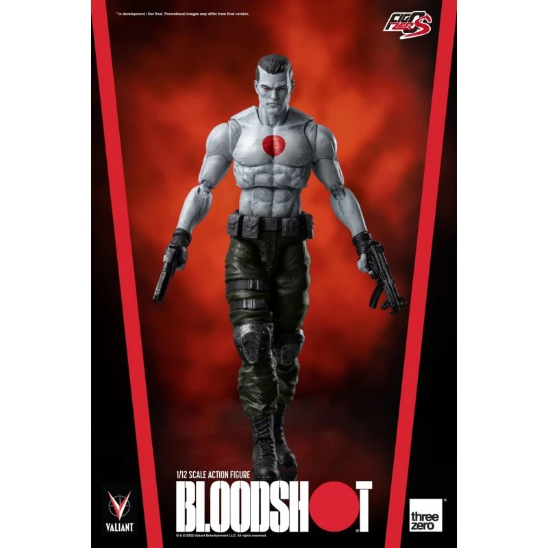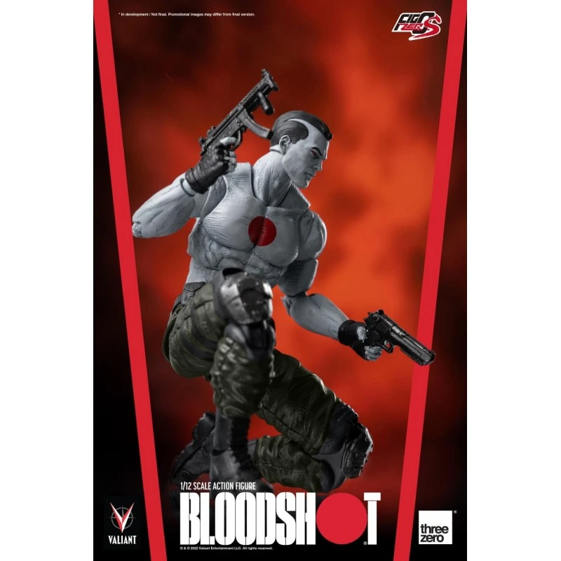 Esta figura de Bloodshot está inspirada en el personaje de Valiant y pertenece a la colección FigZero de ThreeZero. Está en escala 1:12 y mide aproximadamente 15,2 centímetros de altura. Presenta un cuerpo completamente articulado con hasta 39 puntos de articulación.