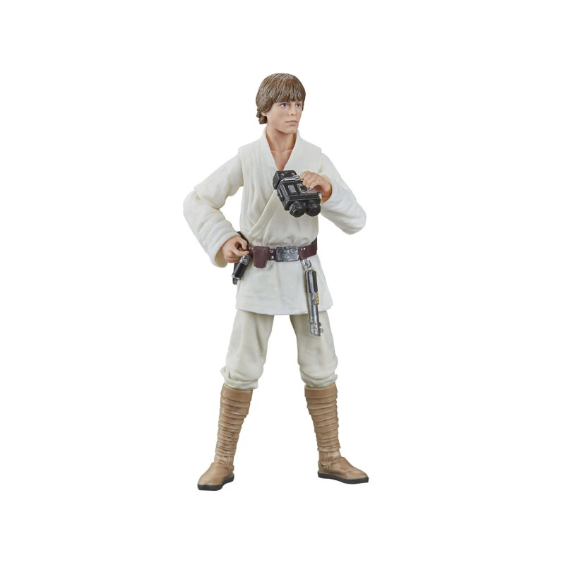 Esta figura de Luke Skywalker está inspirada en la película Star Wars: Una Nueva Esperanza y pertenece a la colección Star Wars Black Series de Hasbro. Mide 15 centímetros de altura aproximadamente y está fabricada en PVC.