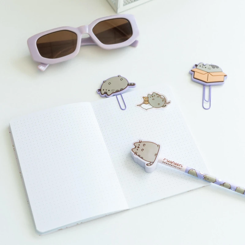 Este kit de papelería de Pusheen Moments es un complemento ideal para la oficina, el colegio, la universidad, etc. Contiene un bolígrafo con goma de borrar, 3 cuadernos de tamaño A6, un lápiz con tope de goma de borrar, un estuche transparente con 4 subrayadores de diferentes colores, 2 clips con topper de silicona y un pack con diferentes tipos de notas adhesivas. Todo viene dentro de un estuche fabricado de PU y PVC con cremallera y diseño a juego.