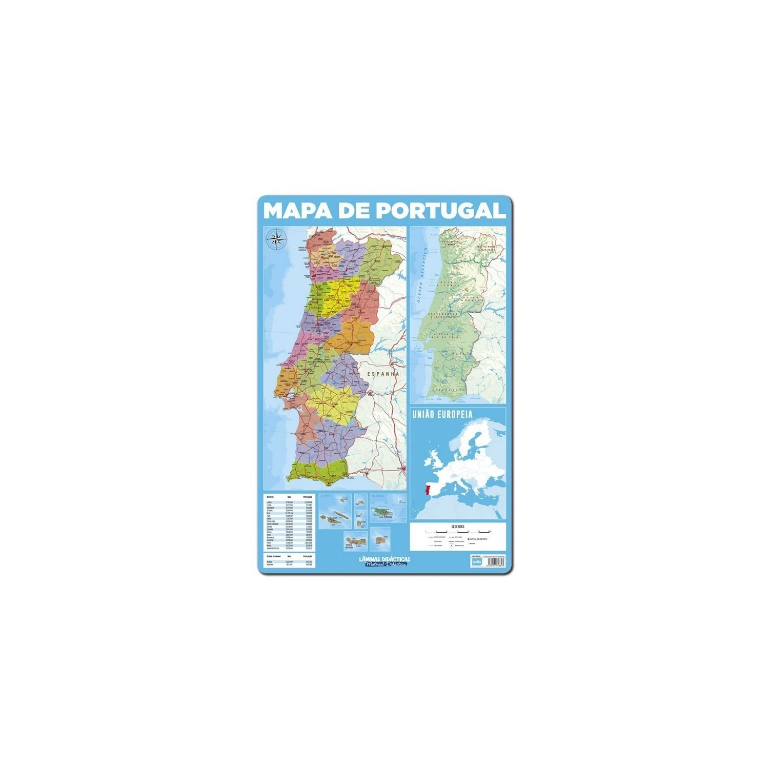 Lámina Didactica Portugues Mapa de Portugal será la compañera perfecta para todo el curso escolar. Tenemos los diseños más solicitados por todo el mercado. Tiene unas medidas de 40 x 59,5 cm. Está fabricada en polipropileno.