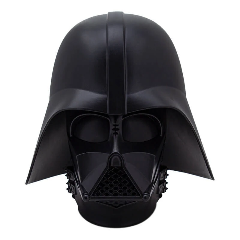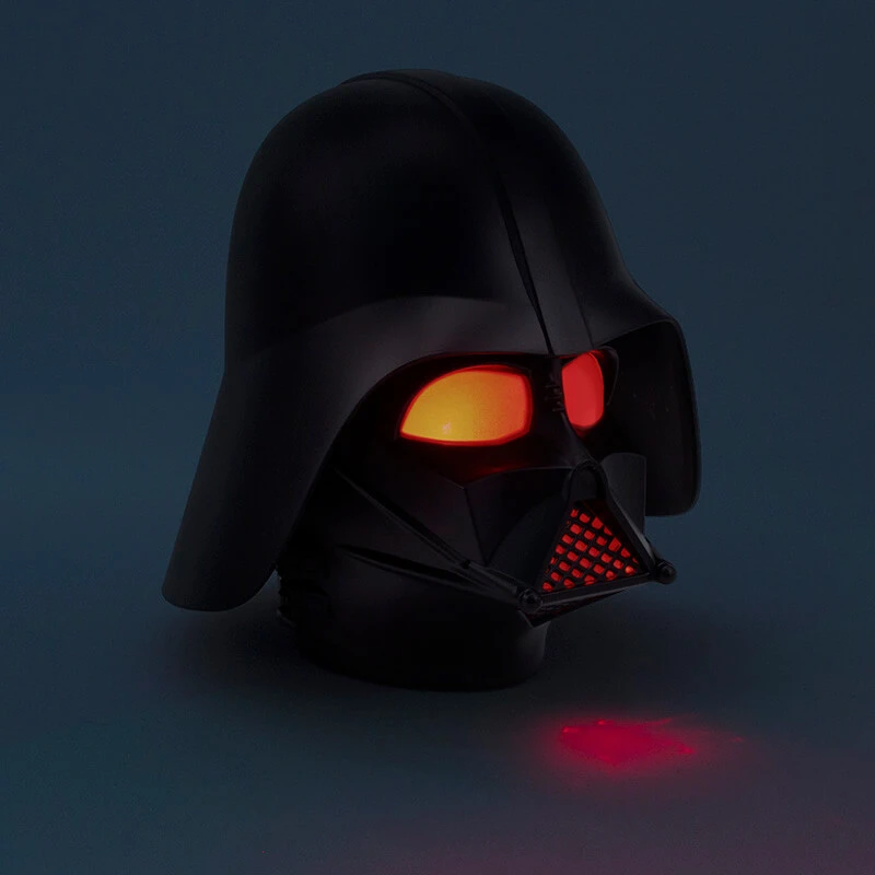 Esta lámpara 3D de Star Wars tiene la forma del icónico casco negro de Darth Vader. Emite una luz fija de color rojo a través de los ojos y la rejilla de la boca y reproduce sonidos mecánicos y de respiración inspirados en el Lord Sith. Está fabricada en PVC de gran calidad y mide 14 cm de altura aproximadamente. Funciona con 2 pilas AAA (no incluidas).