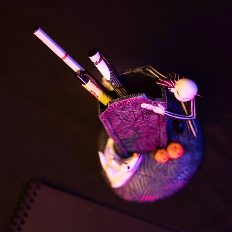Este lapicero 3D de Pesadilla Antes de Navidad muestra a Jack Skellington junto a su perro Zero. Viene con un set de escritura que incluye 3 bolígrafos, un lápiz y un sacapuntas. Está fabricado en cerámica de gran calidad.
