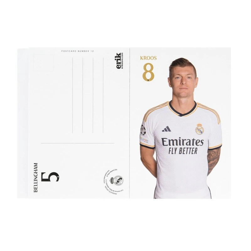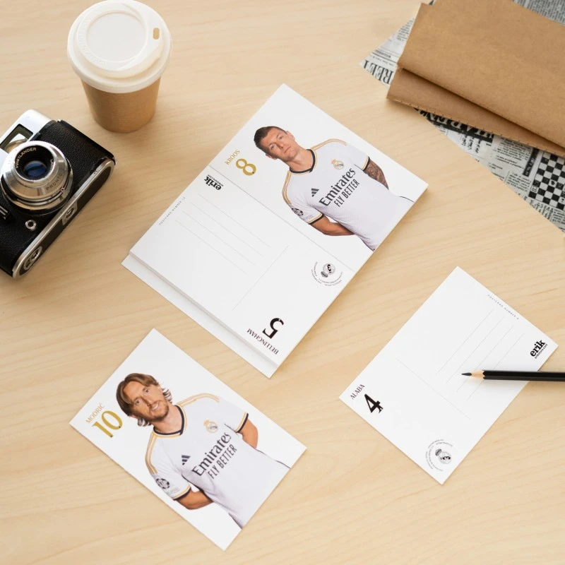 Este libro de postales incluye un total de 25 postales con todos los jugadores de la plantilla, el entrenador y el escudo del Real Madrid. Cuenta con ilustraciones a todo color en la parte delantera y un espacio destinado a la escritura en la parte trasera. Todas las postales tienen homologación para ser utilizadas como carta. Respecto a su tamaño, mide aproximadamente 10,5 x 14,7 cm.