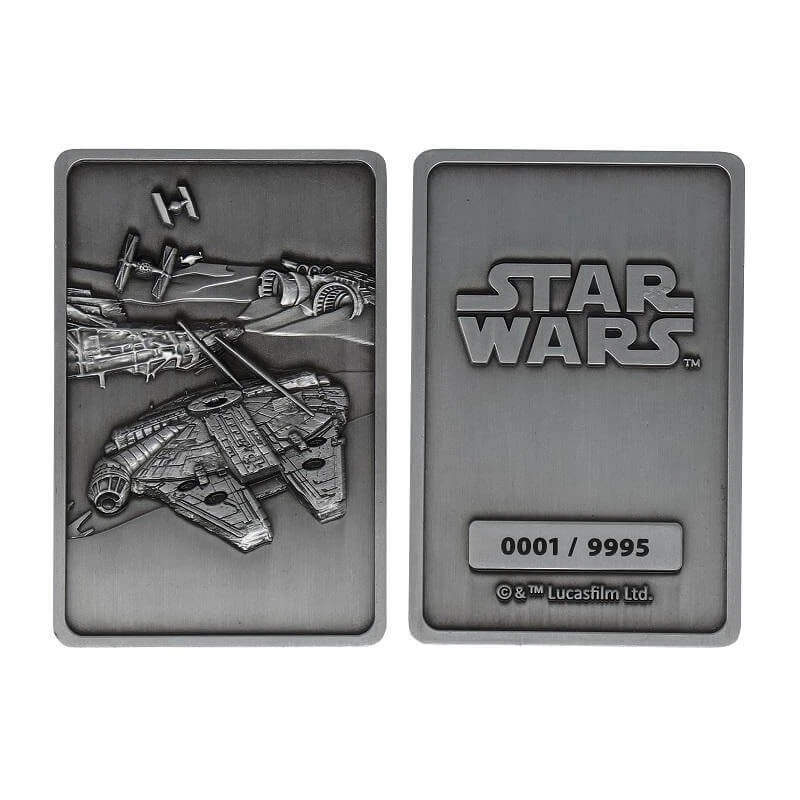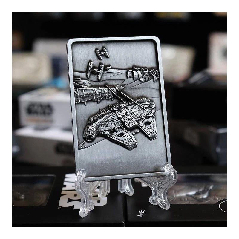 Este lingote muestra al Halcón Milenario sobrevolando el desierto de Tatooine mientras es perseguido por varios cazas estelares TIE.