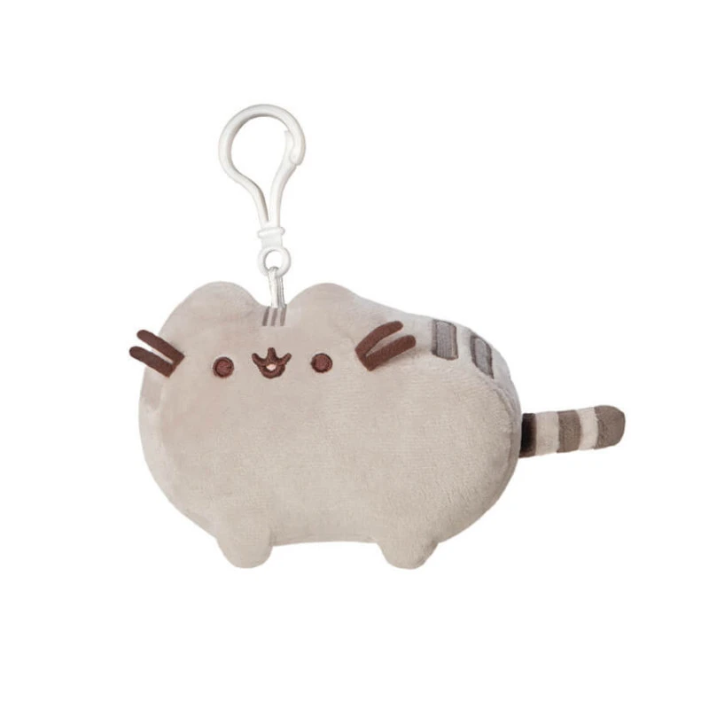 Este llavero de peluche de Pusheen tiene un tamaño aproximado de 8 centímetros. Ha sido fabricado con materiales plásticos reciclados y cuenta con detalles bordados y relleno interior de fibra. Incluye un enganche de plástico para colgarlo.