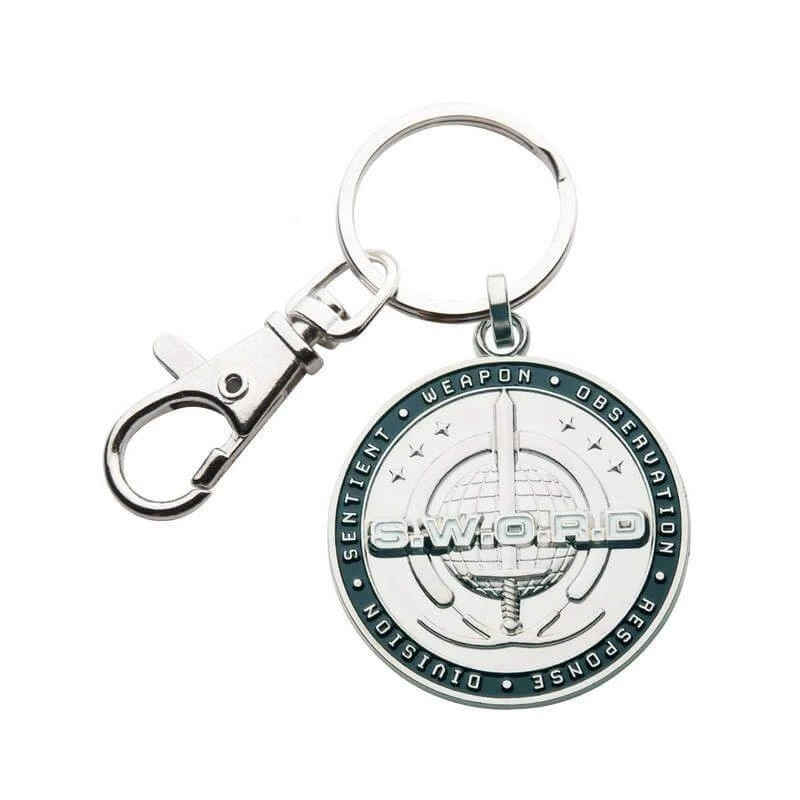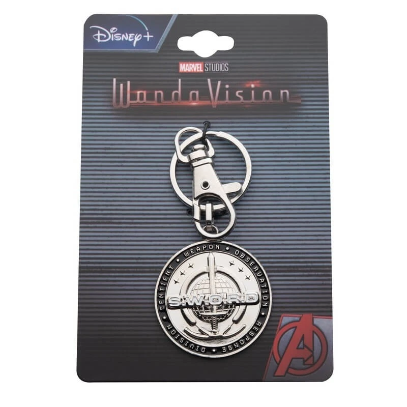 Este llavero con el logo de S.W.O.R.D. está inspirado en la serie de Marvel Wandavision. Está fabricado en metal esmaltado y cuenta con una anilla y un clip de metal para colgarlo.