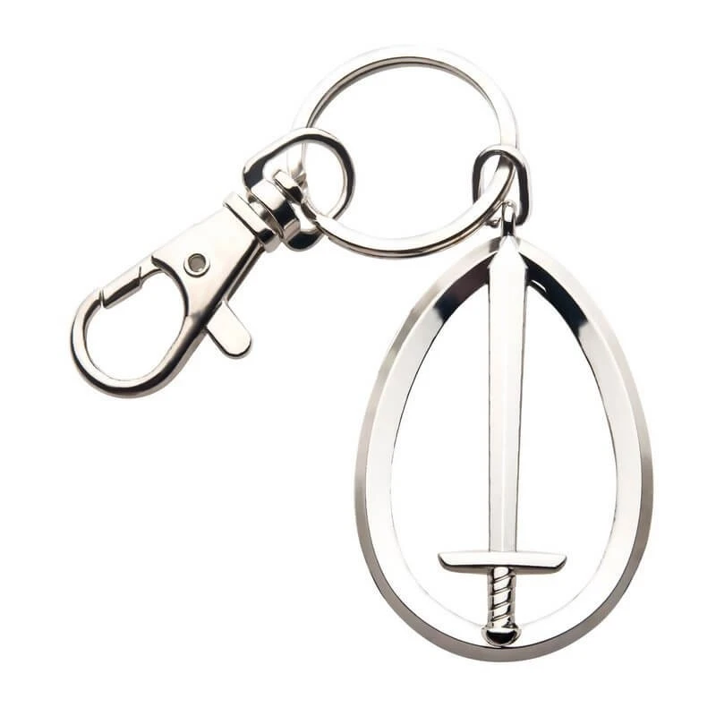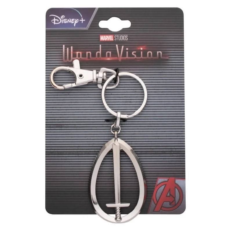 Este llavero está inspirado en el símbolo de S.W.O.R.D. de la serie de Marvel Wandavision. Está fabricado en acero inoxidable y cuenta con una anilla y un clip de metal para colgarlo.