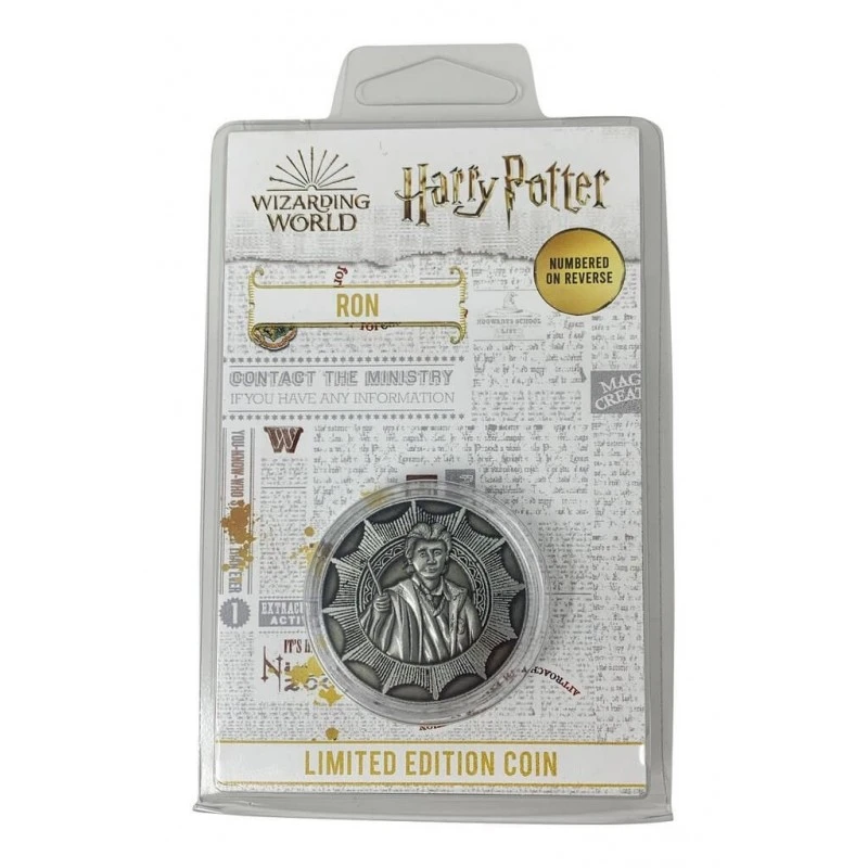 Está fabricada en metal y muestra la silueta en relieve de Ron Weasley en un lado y del castillo de Hogwarts en el otro. Numeración individual en la parte trasera. Incluye un soporte especial para su exposición y viene dentro de una caja de presentación.