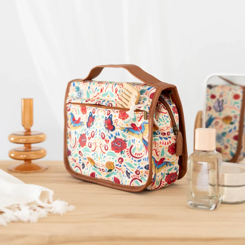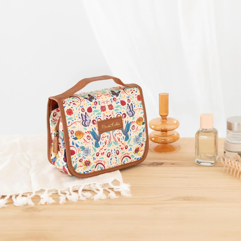 Este neceser colgante de Frida Kahlo puede servir como neceser de viaje y como bolsa organizadora para tus objetos personales. Su diseño está compuesto por un bonito estampado con motivos florales inspirados en Frida Kahlo.