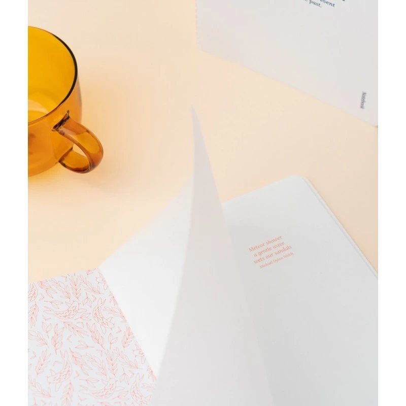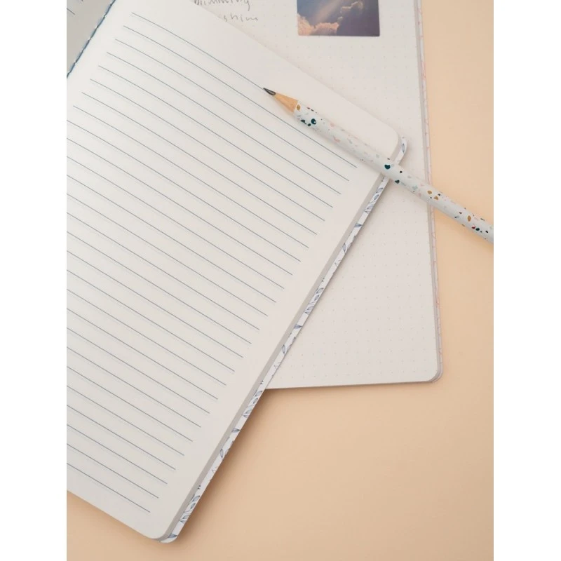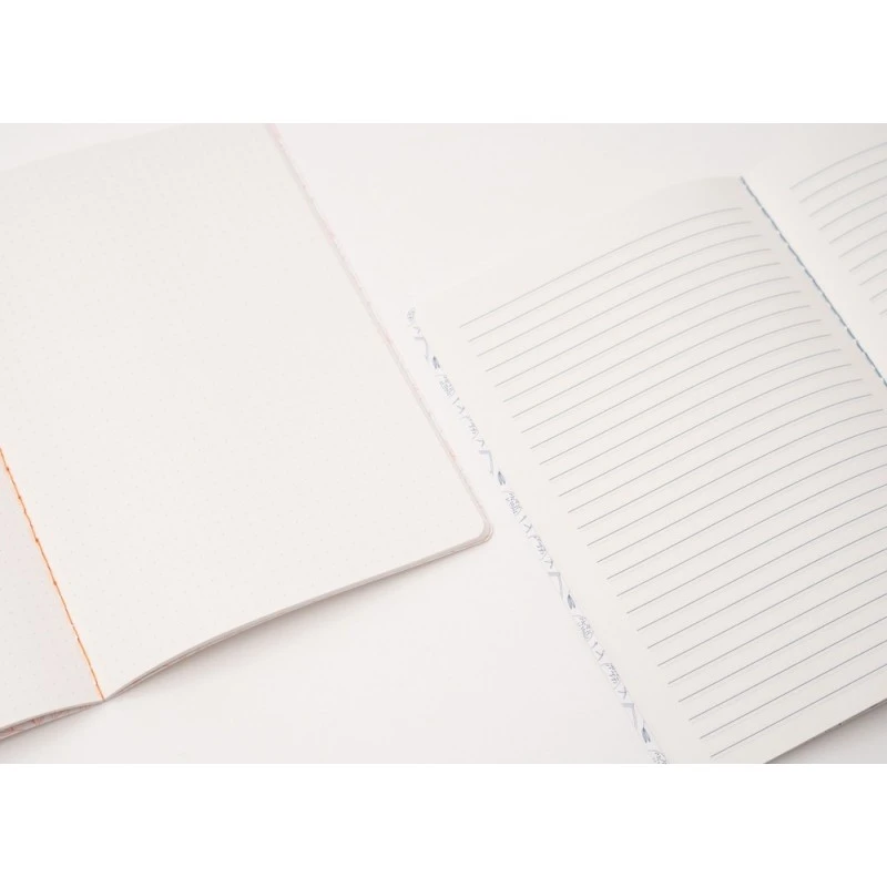 Cuadernos A5 de tapa blanda y encuadernación cosida. Incluye dos cuadernos, uno pautado y otro con puntos, de 28 páginas cada uno.