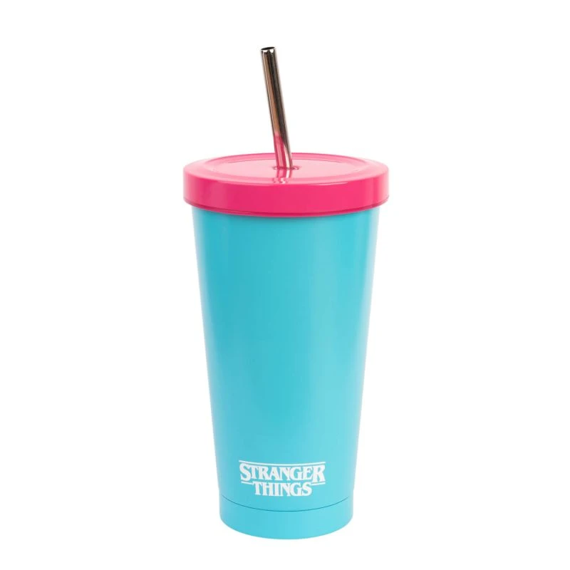 - Vaso Con Pajita Stranger Things Rink-O-Mania: Está fabricado en acero inoxidable y tiene pared de doble capa para mantener la temperatura de tu bebida caliente durante 4 horas y fría durante 8 horas. Mide aproximadamente 18,5 cm de altura y 10 cm de diámetro. Cuenta con tapa hermética y pajita metálica y tiene capacidad para 550 mililitros. Incluye además un utensilio de limpieza para la pajita.