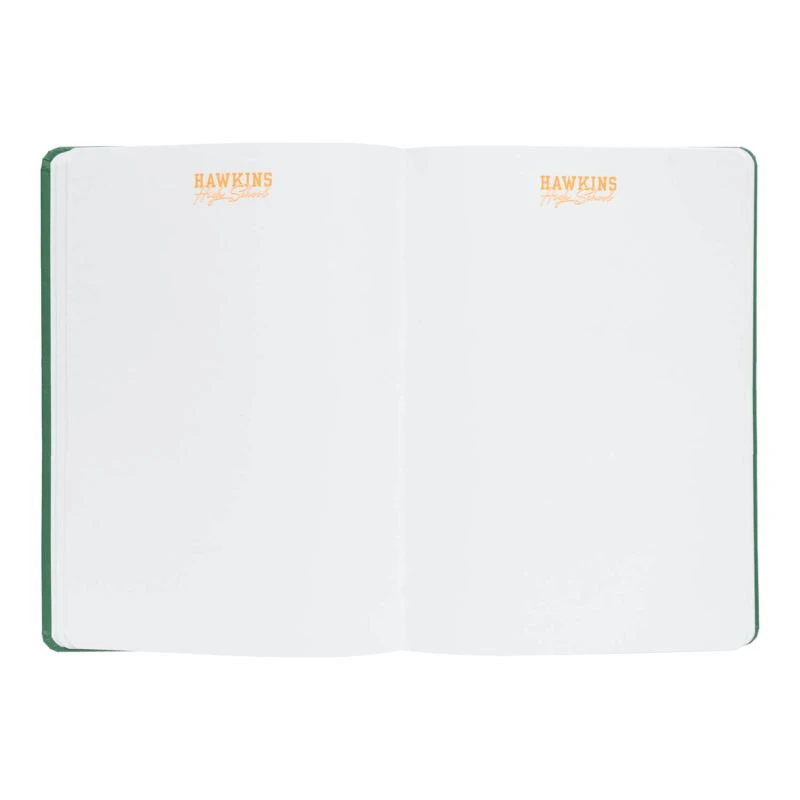 - Cuaderno A5 Stranger Things Hawkins High School: Tiene un total de 96 hojas (192 páginas) de tamaño A5 con un grosor de 100 gramos. Presenta cubierta laminada en mate con tacto suave, esquinas redondeadas y encuadernación encolada. El interior cuenta con hojas punteadas de estilo bullet. Incluye un bolsillo interior, cinta de marcapáginas y una hoja de pegatinas.