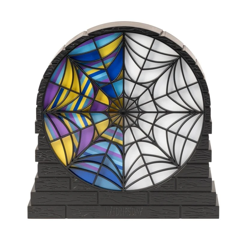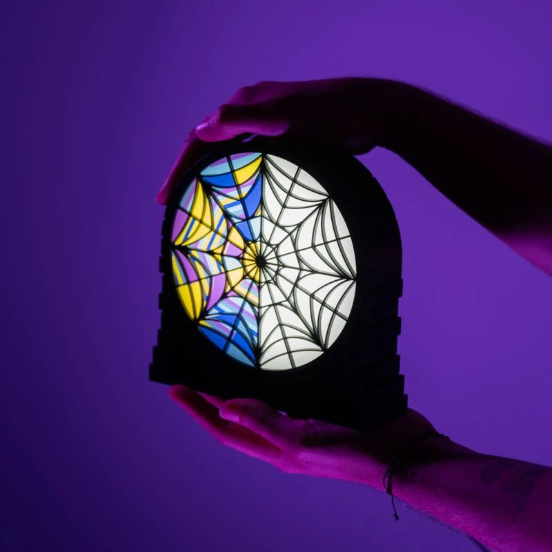 - Lámpara Ophelia Hall Window: Inspirada en la ventana de la habitación de Miércoles, esta lámpara cuenta con un único modo de iluminación que se acciona mediante un botón de control situado en la parte trasera de la misma. Funciona con 3 pilas AAA 1.5V (no incluidas) o un cable USB tipo C con entrada 5V DC 1A (incluido). Está fabricada en ABS y tiene unas medidas de 16 x 17 x 4,7 cm.