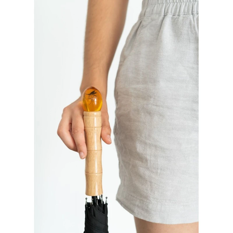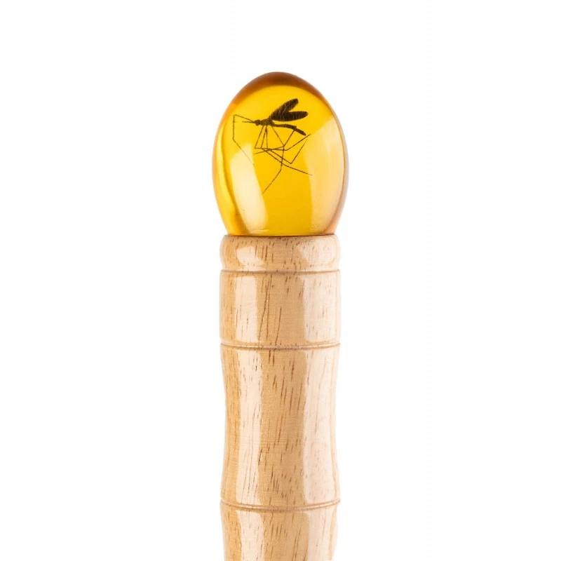 El mango está hecho en madera de caucho y lleva incorporado en su extremo un elemento decorativo de resina que contiene un mosquito, inspirado en el bastón de John Hammond que aparece en la película.