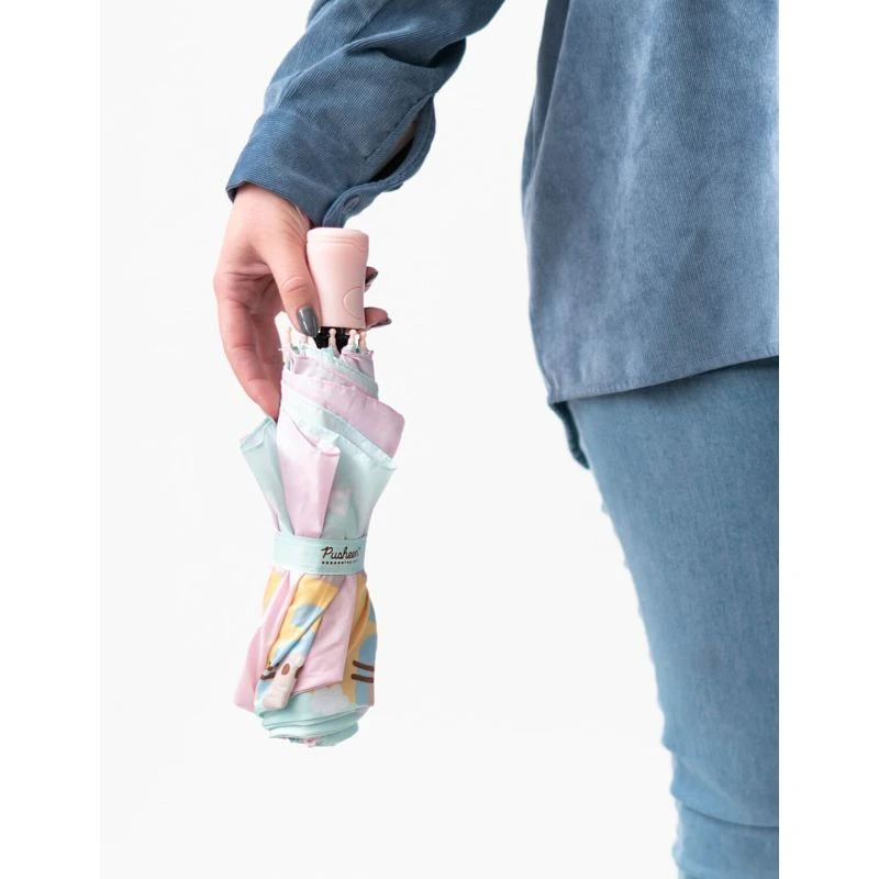 Este paraguas plegable de Pusheen está fabricado en poliéster y cuenta con estructura resistente de metal y PVC. El mango es de metal extensible con sistema de apertura automático. Respecto a su tamaño, tiene unas medidas de 30 x 7 cm cerrado, y una vez abierto mide 100 cm de diámetro y 57 cm de alto. Pesa 370 gr por lo que es perfecto para llevar a cualquier parte y no olvidarte de él en los días más lluviosos.