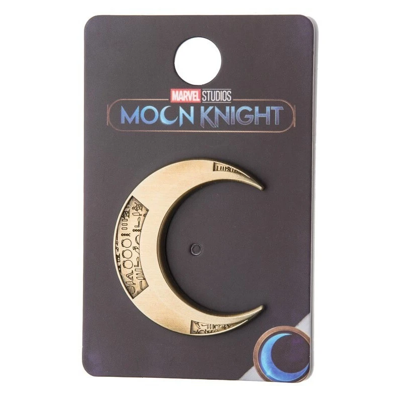 Este pin está inspirado en la serie Moon Knight y representa la luna creciente que Caballero Luna usa como arma arrojadiza. Está fabricado de acero inoxidable y cuenta con un diseño único de gran calidad. Mide aproximadamente 12,75 cm de altura.