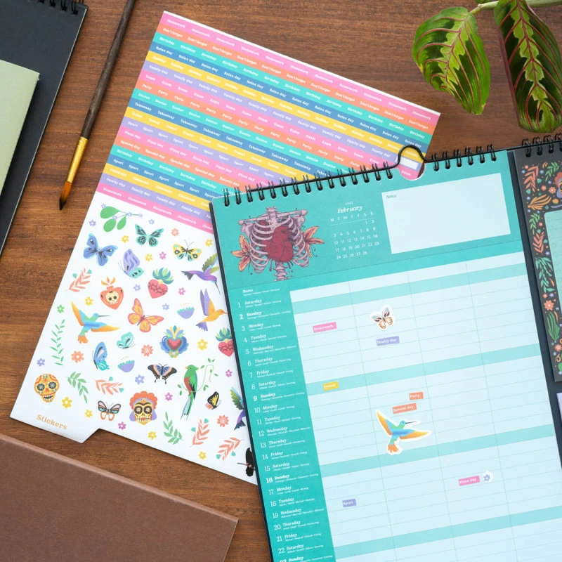 Este planner mensual también puede utilizarse como agenda mensual, ya que cuenta con una hoja por mes con espacio para anotaciones organizado en columnas. Incluye un bloc para hacer lista de la compra, un bloc de post it de 70×75 mm y otros 2 de 32×68 mm, una hoja de pegatinas y un bolígrafo.