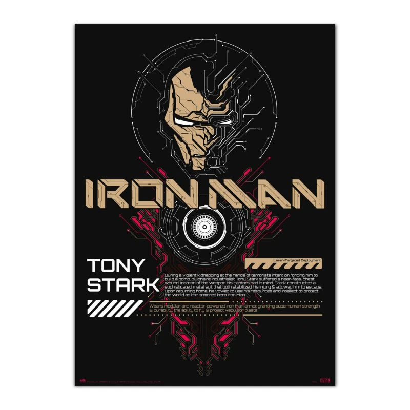 Este póster de Iron Man cuenta con un diseño impreso con tinta luminiscente que hace que se ilumine en la oscuridad una vez haya absorbido luz natural o UV.