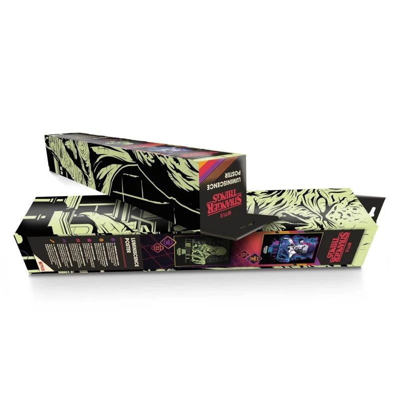 Este póster de Stranger Things cuenta con un diseño impreso con tinta luminiscente que hace que se ilumine en la oscuridad una vez haya absorbido luz natural o UV.
