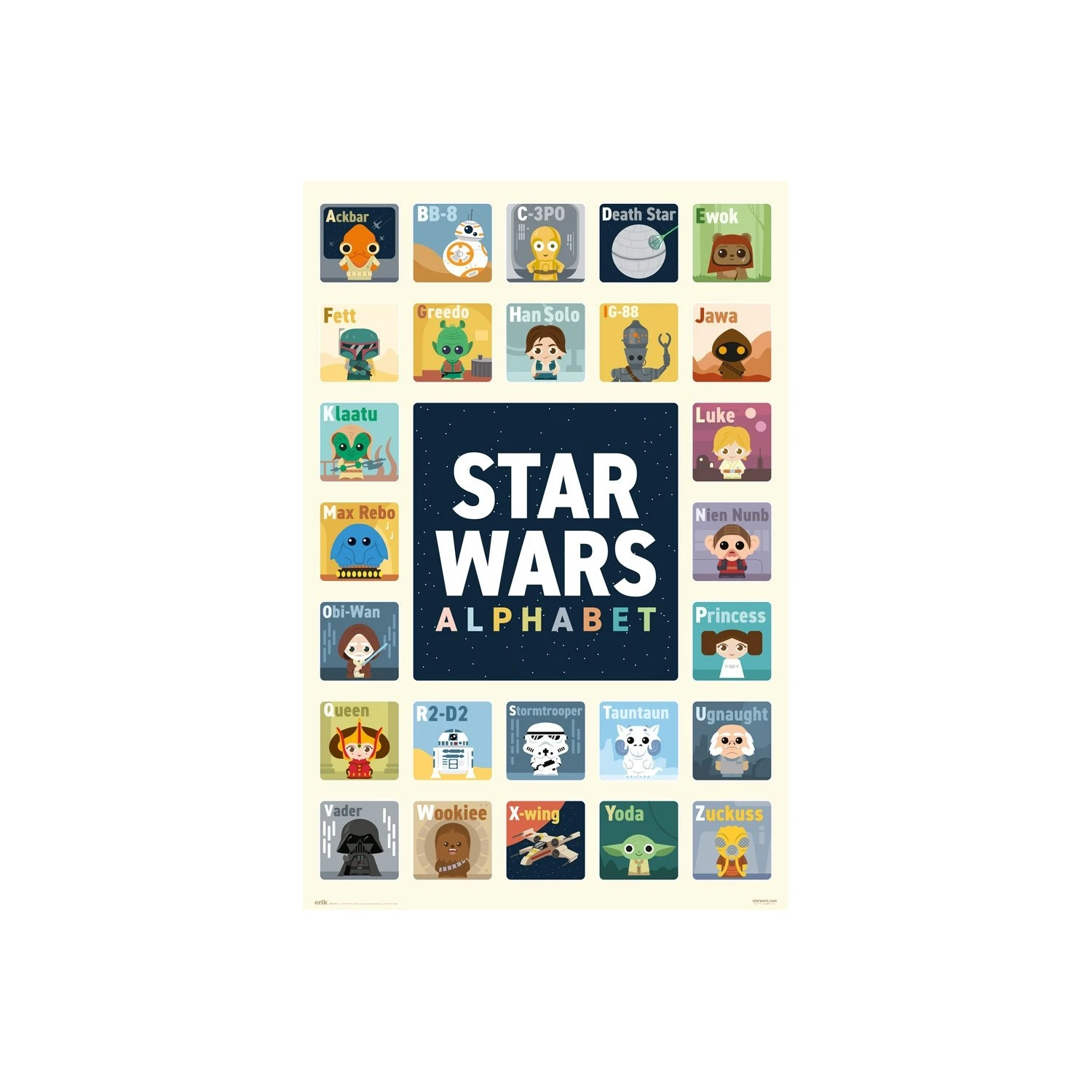 - Decora tus paredes con este póster del alfabeto de Star Wars, con los personajes de la saga.