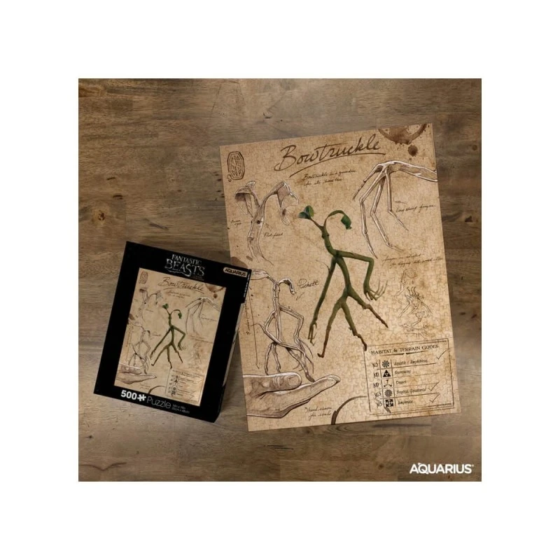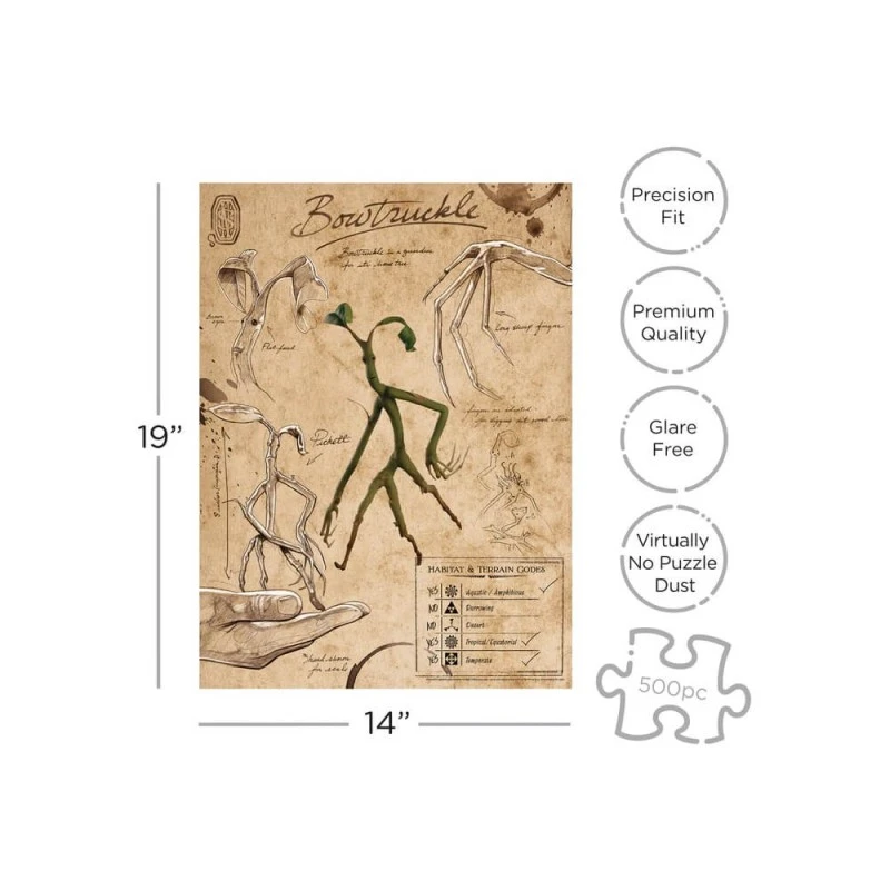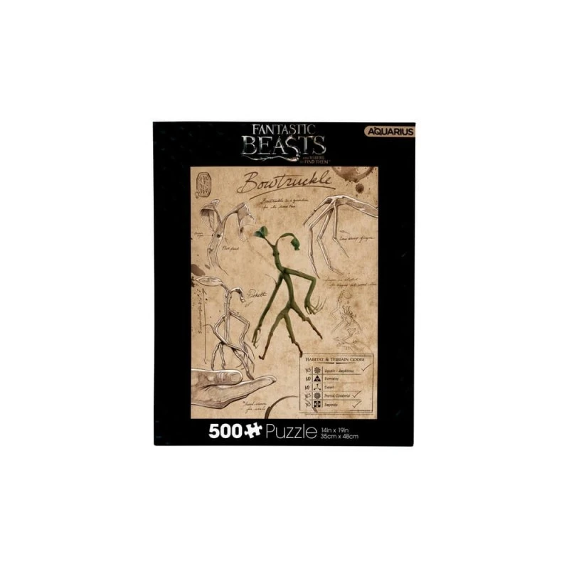 Este puzzle de Harry Potter está inspirado en la saga de Animales Fantásticos y cuenta con un total de 500 piezas. Tiene orientación vertical con un tamaño de 35 centímetros de ancho por 48 centímetros de alto. Viene presentado dentro de una caja de cartón.