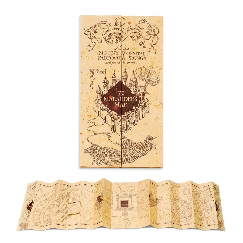 Este producto es una réplica original a escala real 1:1 del auténtico Mapa del Merodeador que aparece en la saga de películas de Harry Potter. Está fabricado en papel de pergamino de gran calidad y cuenta con un práctico pre-doblado para poder abrirlo y cerrarlo con facilidad sin que se estropee. Respecto a su tamaño, mide aproximadamente 39,5 x 21 cm (cerrado) y 185 x 39,5 cm (abierto).