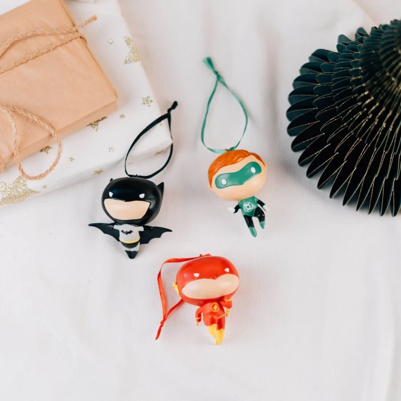 Este set de adornos de navidad de DC Comics incluye al trío de superhéroes Batman, Flash y Linterna Verde.