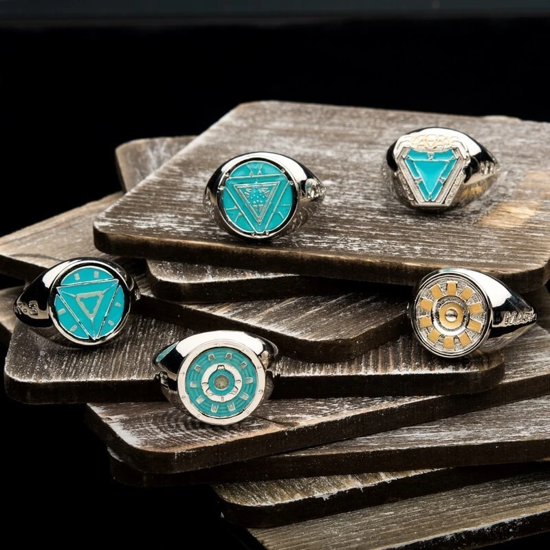 Este set de anillos de Iron Man está inspirado en los reactores de arco que lleva el superhéroe de Marvel en sus diferentes armaduras. Contiene los modelos Mark I, Mark II, Mark III, Mark VI y Mark VIII.