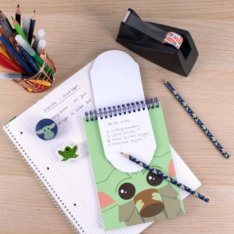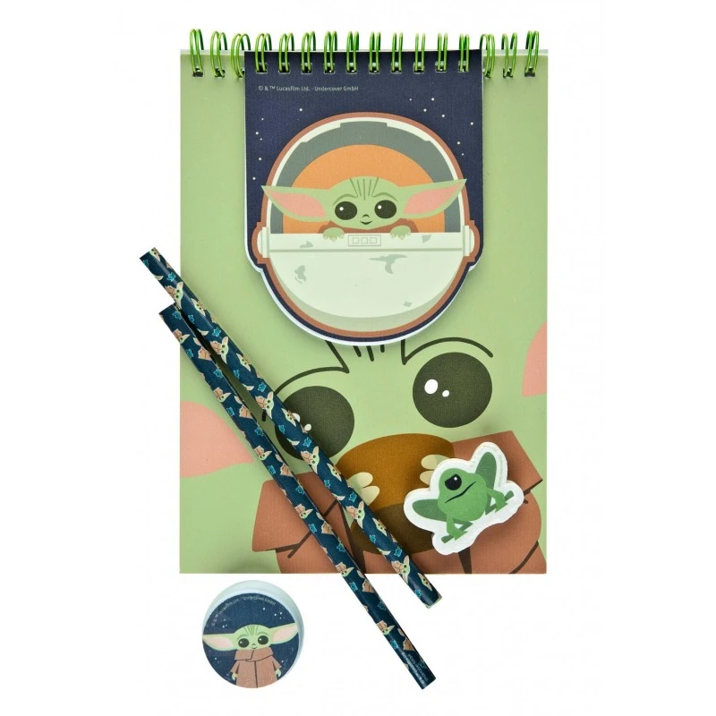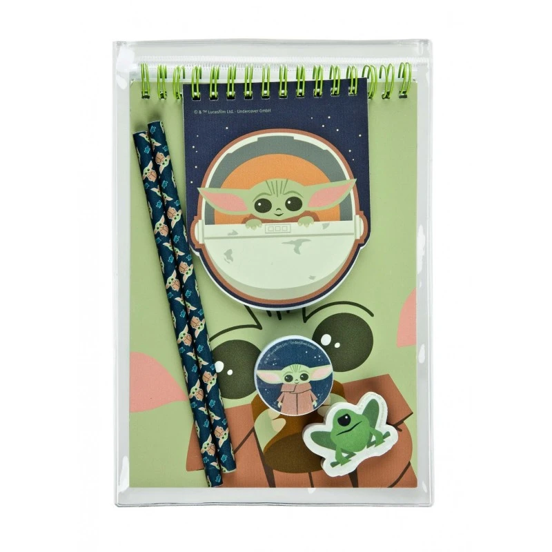 Este set de escritura inspirado en el personaje de Star Wars: The Mandalorian es el complemento ideal para el colegio, la universidad, la oficina, etc. Contiene 2 lápices, una goma de borrar con forma, un sacapuntas y un cuaderno con doble anilla que incluye a su vez un cuaderno más pequeño. Viene protegido dentro de bolsa de PVC transparente.