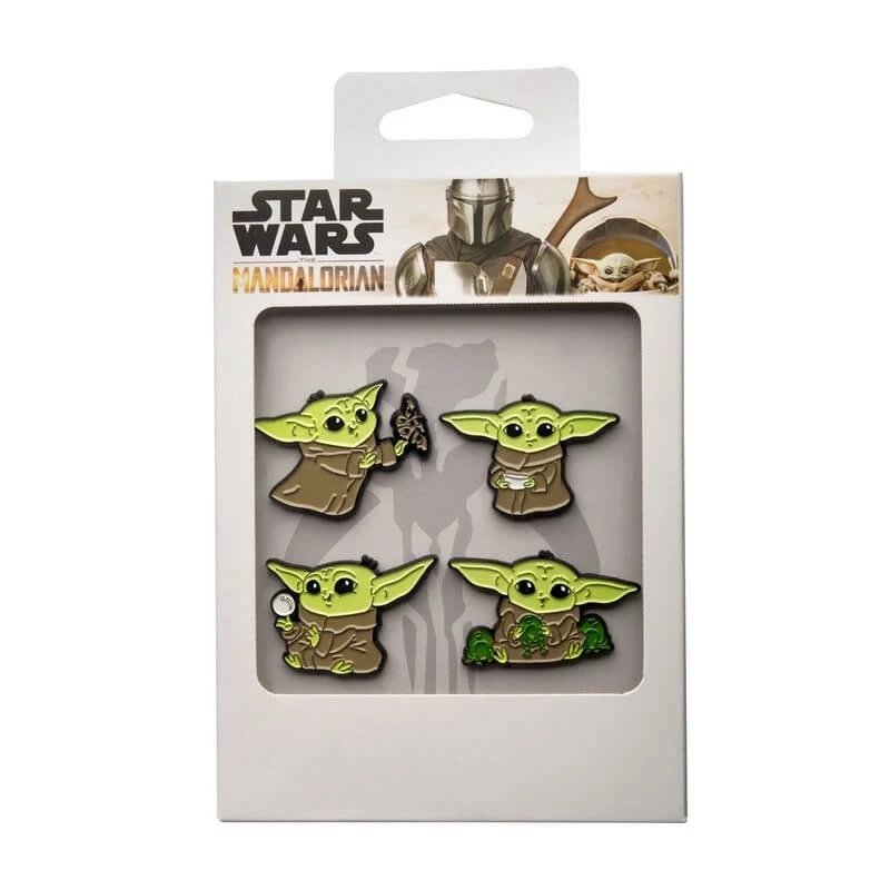 Este set contiene 4 pins de Grogu The Child, también conocido como Baby Yoda, uno de los personajes protagonistas de la serie Star Wars: The Mandalorian. Están fabricados en metal con acabados esmaltados y tienen un tamaño aproximado de 35 milímetros.