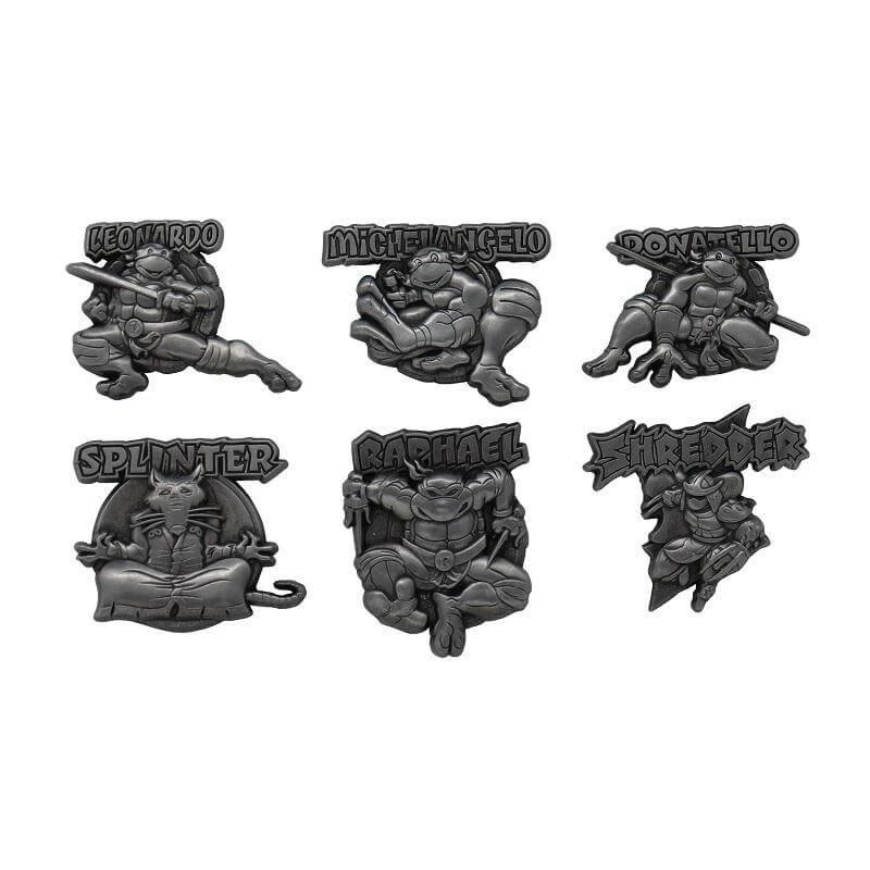 - Michelangelo, Donatello, Leonardo, Raphael, Splinter y Shredder. Set de 6 pins fabricados en metal.