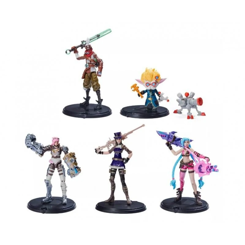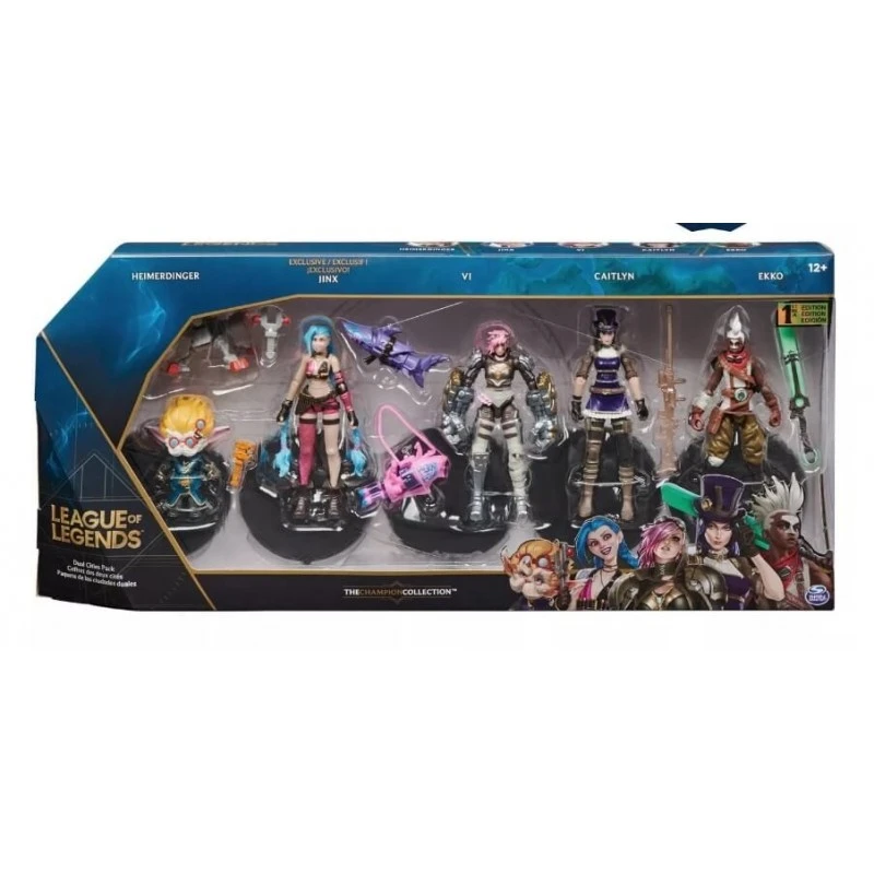 El pack de figuras Dual Cities de League of Legends incluye a 5 conocidos personajes del famoso MOBA: Caitlyn con su rifle Hextech, Ekko con su bate, Jinx con Fishbone y Pow-Pow, la imponente Vi y el excéntrico profesor Heimerdinger con su torreta y sus herramientas.